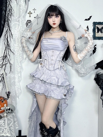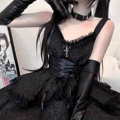 Eyelash-like lace around the camisole, lace ribbon at the side waist, and the most aesthetic red rose on the chest part, you must be the most beautiful elegant goth princess in the party.